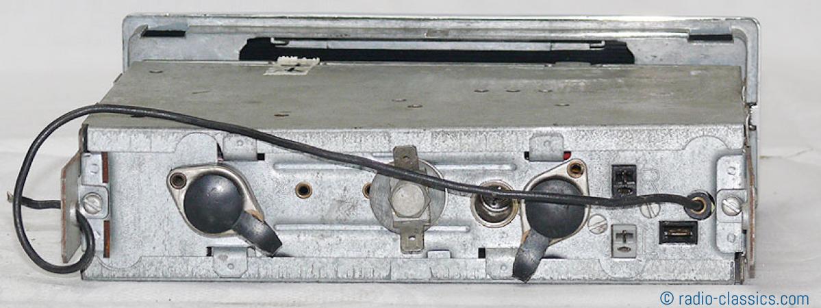 This oldtimer radio has a 12-V-connection, two speaker connectors, one antenna socket, one electric antenna connector, two connectors for additional equipment.